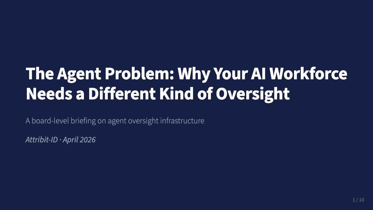 10-slide board briefing on AI agent oversight infrastructure and the four governance properties boards should verify.