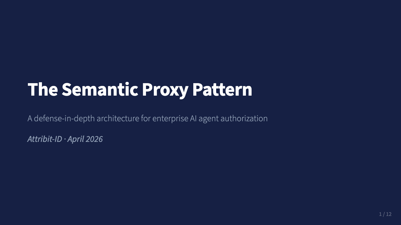 12-slide technical reference on the semantic proxy pattern: three-layer defense architecture for enterprise AI agent authorization.