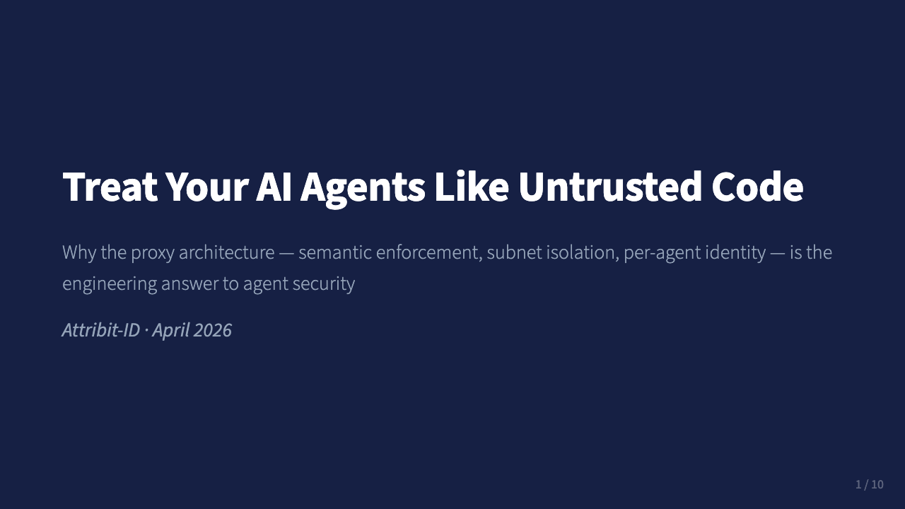 10-slide deck on the three-layer agent security architecture: semantic proxy, subnet isolation, per-agent identity.